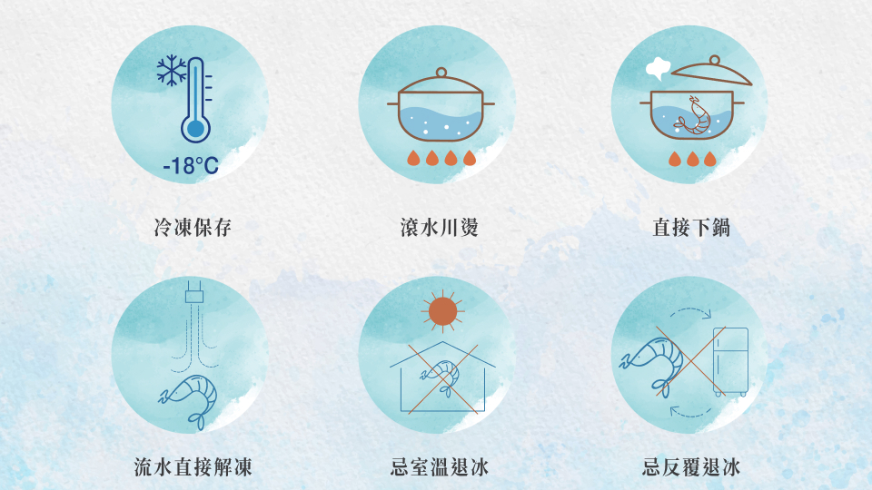 使用流水退冰,保持蝦頭完整不發黑,視覺與味覺都更新鮮!切勿室溫退冰或重複退冰